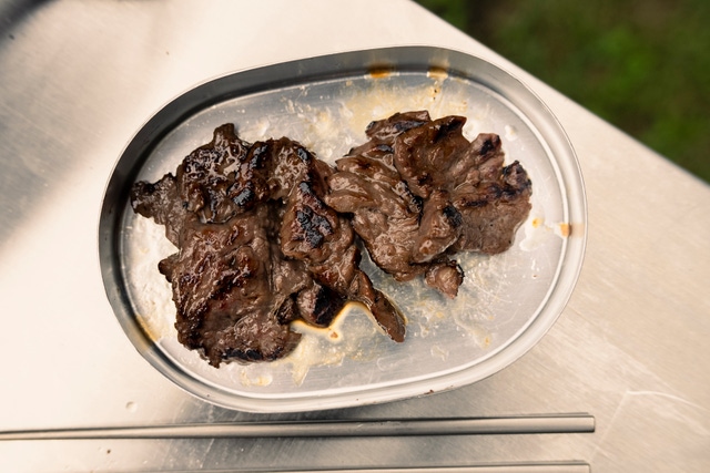 柔らかいのに脂が少なく、肉の旨味がぎゅっとつまった肉がハラミ。さっぱりとしていて、胸焼けなどになりにくい、さっぱり感のある焼き肉を楽しむことができます。カロリーも低く、たんぱく質も豊富なので健康にも良いキャンプめしとなるでしょう。