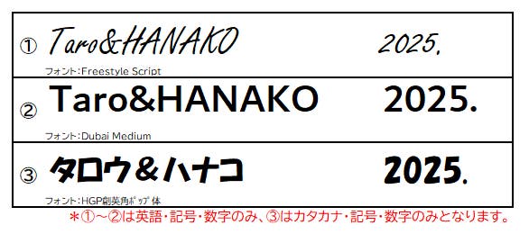 *文字数は本体Sサイズ4文字、Mサイズ10文字、Lサイズ15文字が限度になります。