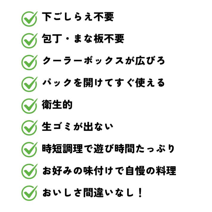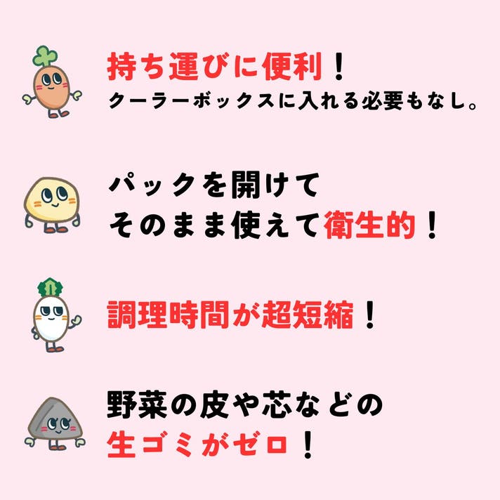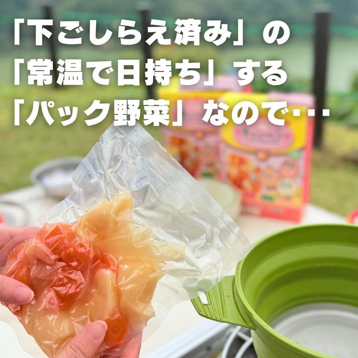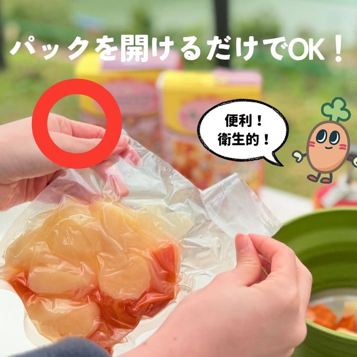 - ビミョーにめんどい野外での野菜調理をスマートに解決!開けてすぐに使える便利なパック野菜です。
