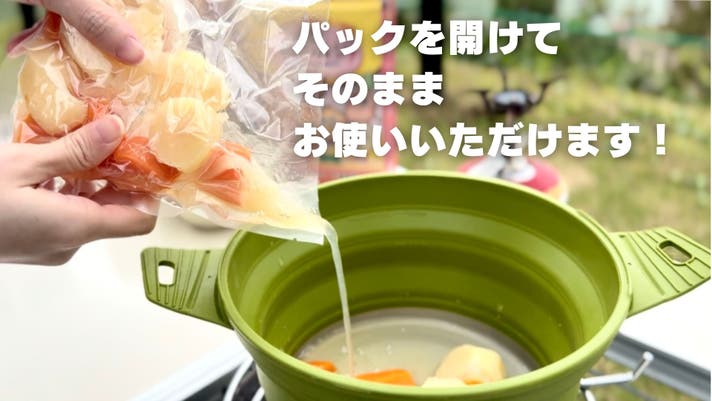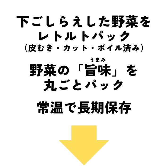 - 下ごしらえ済みの国産野菜を「うまみ丸ごと」パックでおいしさ間違いなし!常温&長期保存も便利!