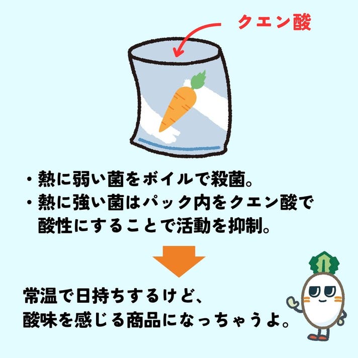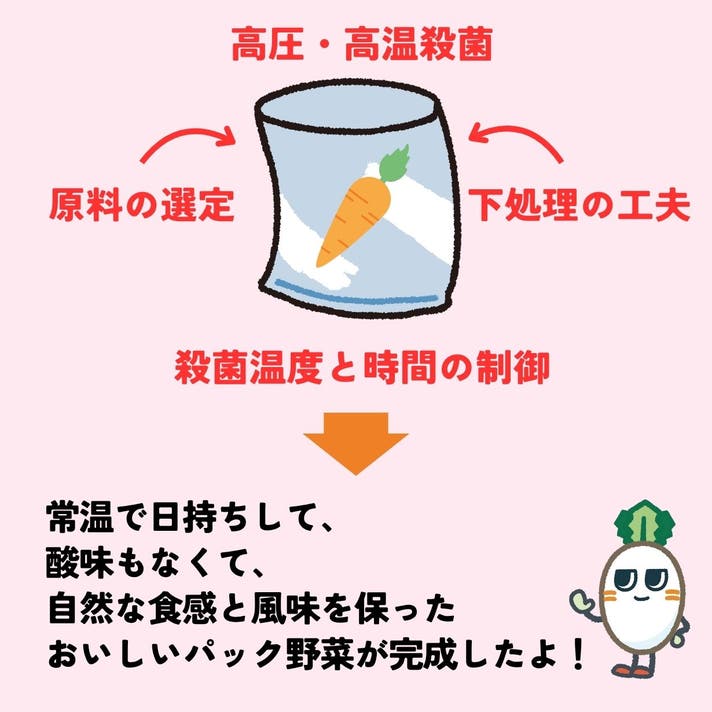 この独自の技術により、「常温で日持ちする、おいしいパック野菜」ができたのです!