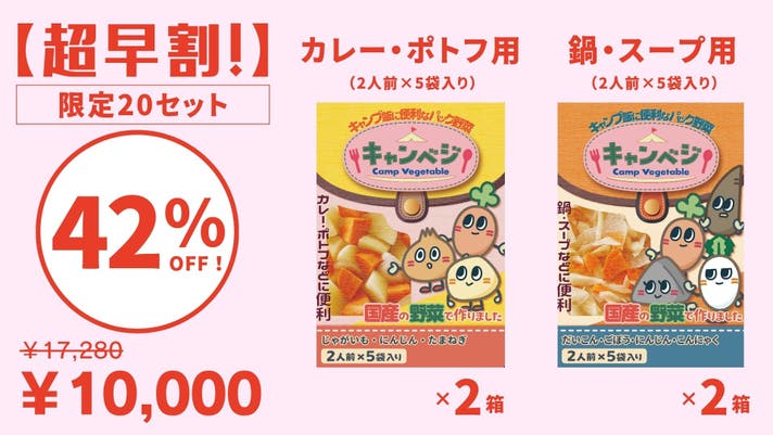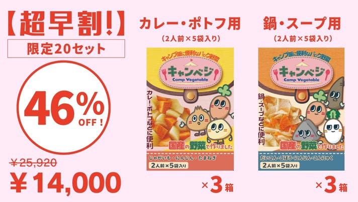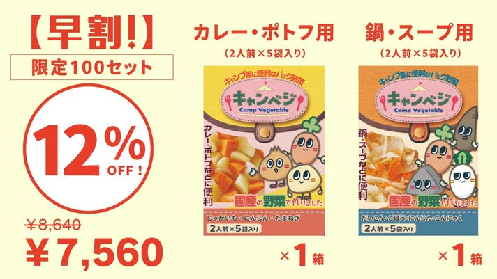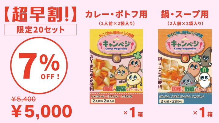 「Makuake(マクアケ)」は、実行者の想いを応援購入によって実現するアタラシイものやサービスのプラットフォームです。このページは、 フードカテゴリの 「【たった10分で完成!】老舗の野菜屋が開発した「キャンプ飯専用」国産パック野菜!」プロジェクト詳細ページです。