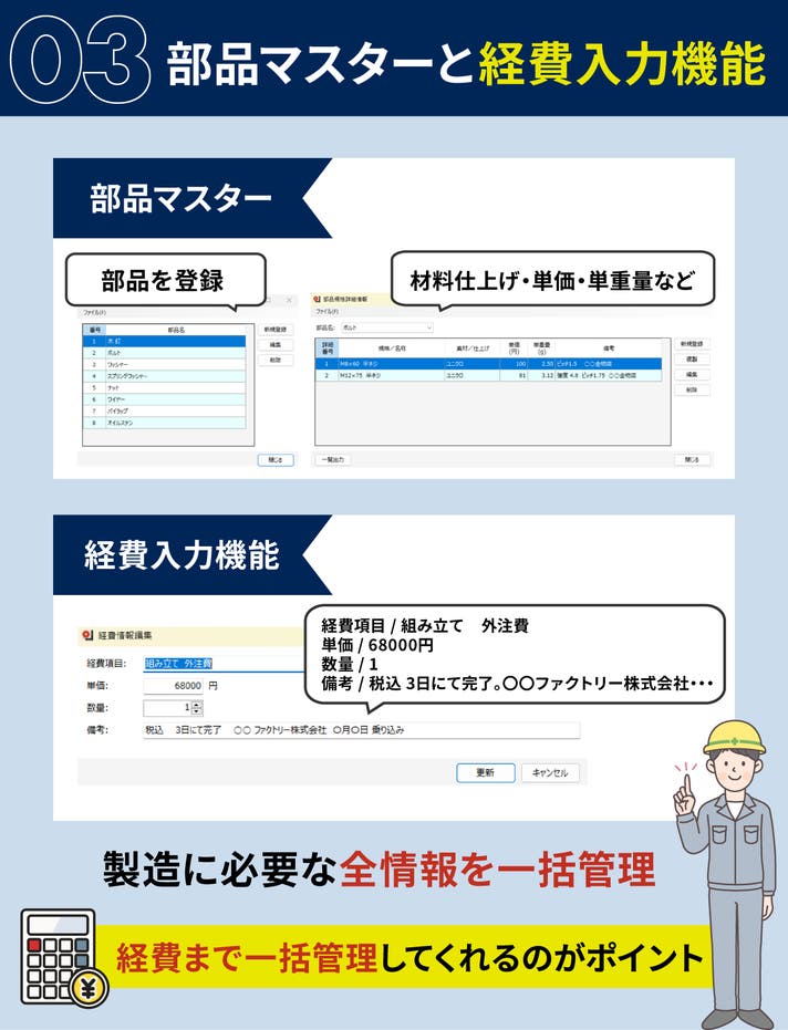 部品マスターと経費入力機能で、製造に必要な全情報を一括管理。工程や製造コストを見える化することで"利益率アップ"