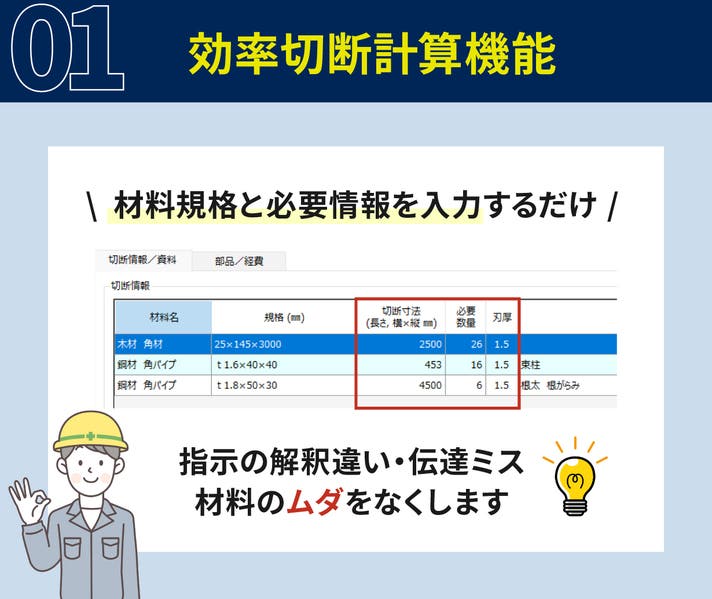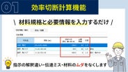 - 材料の手配や加工レイアウトを“見える化”してロスを軽減。切断計算機能で切断イメージをすぐに共有