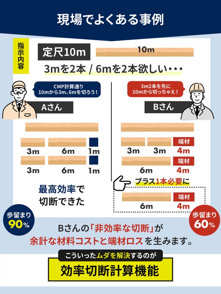 CMPは、材料をムダなく使うための「効率切断計算機能」を標準搭載。