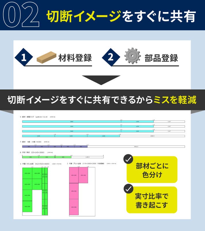 しっかりと製作者の意図を製造に伝えることができる切断計算機能で制作ミスや歩留まり効率をあげます。部材ごとにしっかりと色分けをし、実寸比率で書き起こすので、メモでの伝え間違いや、受け取り違いなどのヒューマンエラーを回避できます。