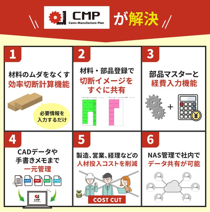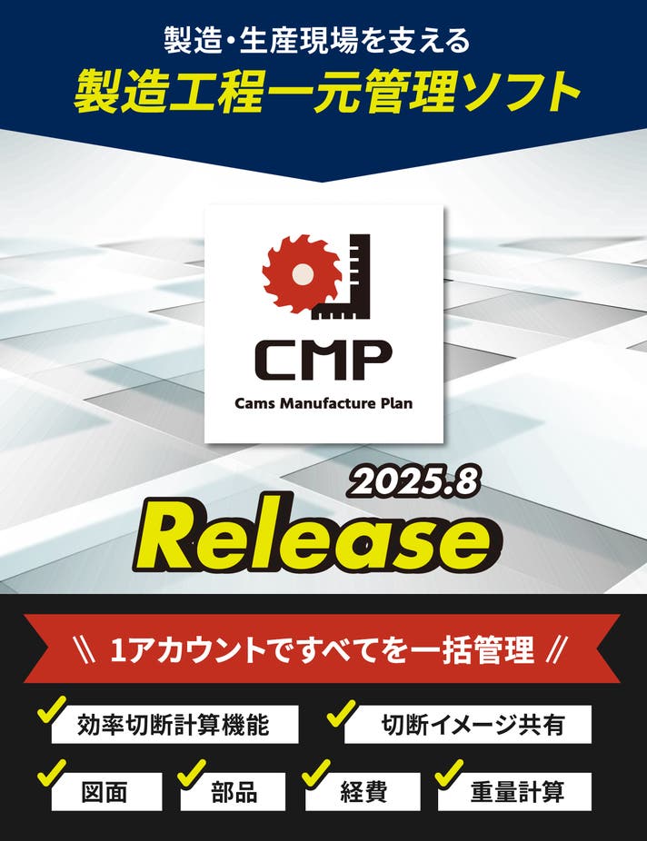 “材料の無駄”を見える化し、様々なコストを抑える。製造現場での材料ロスや切り出しのムダを、自動で最適化できるソフト、それがCMP(Cams Manufacture Plan)です。