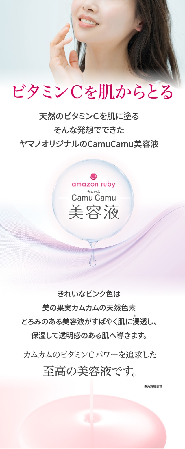 「カムカム」という果実は南米アマゾン原産のフルーツでビタミンC含有量がアセロラの1.5倍、レモンの27倍以上と言われているビタミンCを含むフルーツの中で世界有数のスーパーフルーツです。しかし、カムカム果実は収穫後すぐに劣化が始まり、その高いビタミンCを維持することは大変難しい原料として知られてます。10年の歳月を費やし、赤く完熟したカムカムの品質をそのまま輸入し、自然成分だけを使用した保存方法(合成保存料は一切使用してません)の確立、また、カムカムの持つビタミンC成分をサプリ、石鹸、美容液内等に高純度で閉じ込め、維持することに成功いたしました。