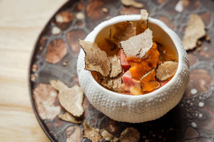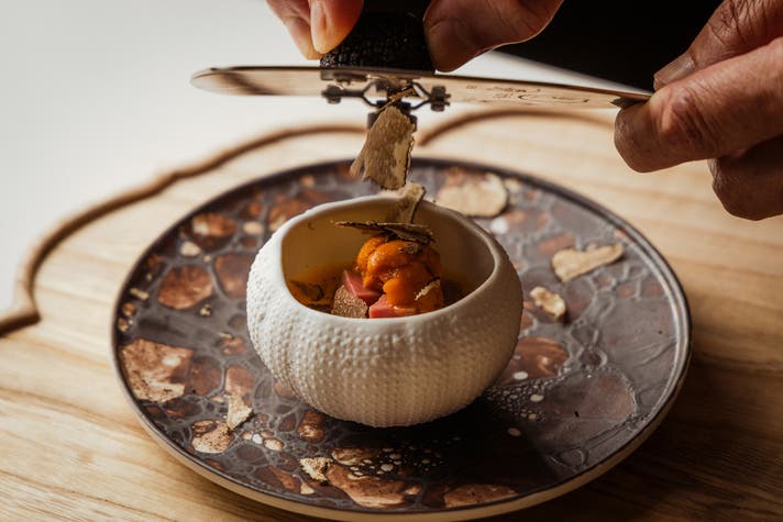 そして「牛タンと雲丹の茶碗蒸し 雲丹のフォームと黒トリュフのアクセント」。
