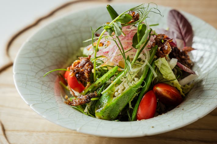 続いて「搾菜の旬のお野菜のサラダ仕立て カリカリ牛テールのアクセント」。