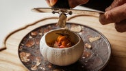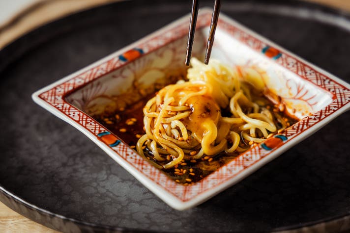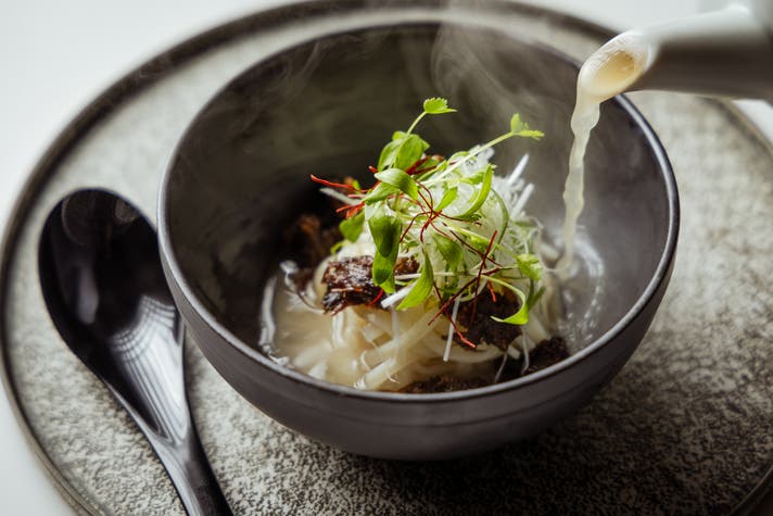 かりかりの牛テールの旨味と青唐辛子の辛みをきかせた麺。清涼感のあるアツアツの出汁と麺で、最後まで和牛のすばらしさをご堪能いただけます。