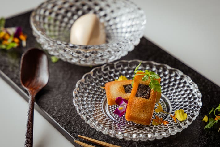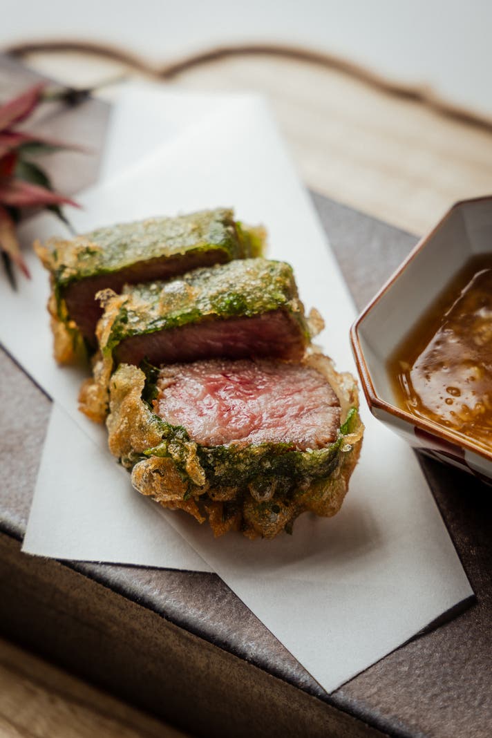 白玉粉をベースとしたグルテンフリーの和牛天婦羅。