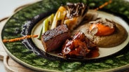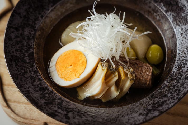続いては「和牛2種ショートリブとかぶりの角煮と蒸し鮑 季節の根菜のおでん」。