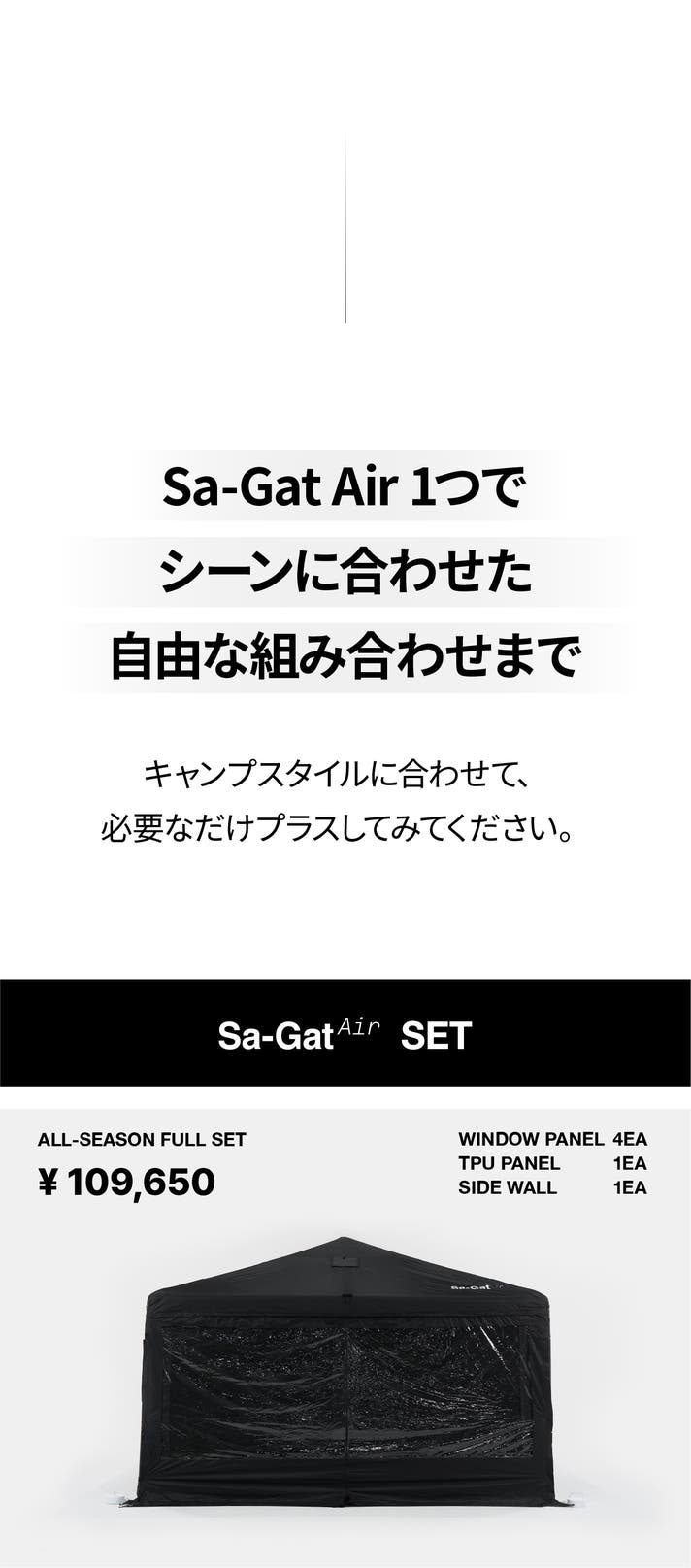 本体、ウィンドウパネル4個、TPUパネル1個、サイドウォール1個が揃った、四季対応のフルセットです。Sa-Gat Airはダブルジッパー構造により、すべてのパネルを単独でも重ねても使用可能。シーンに応じて自由に組み合わせられます。
