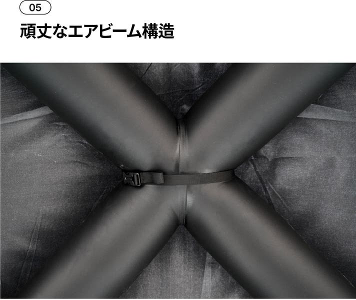 空気を注入して設営する方式で、ポールを曲げてテンションをかけるテントより、設営・撤収時の力をほとんど必要としません。エアービームとタープはウェビングバックルとベルクロで固定され、撤収時にはバルブを開けて空気を抜くだけで簡単に片付けられます。
