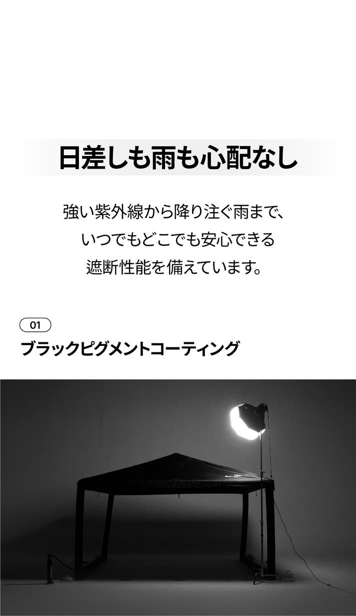 タープ生地の内側にはブラックピグメントコーティングが施され、日差しを遮る効果が高く、タープ下の空間をより涼しく保ちます。