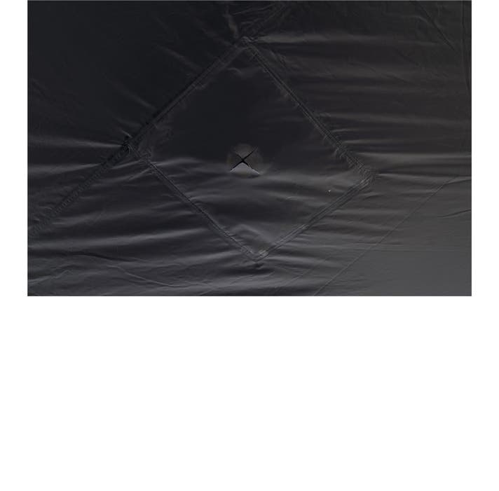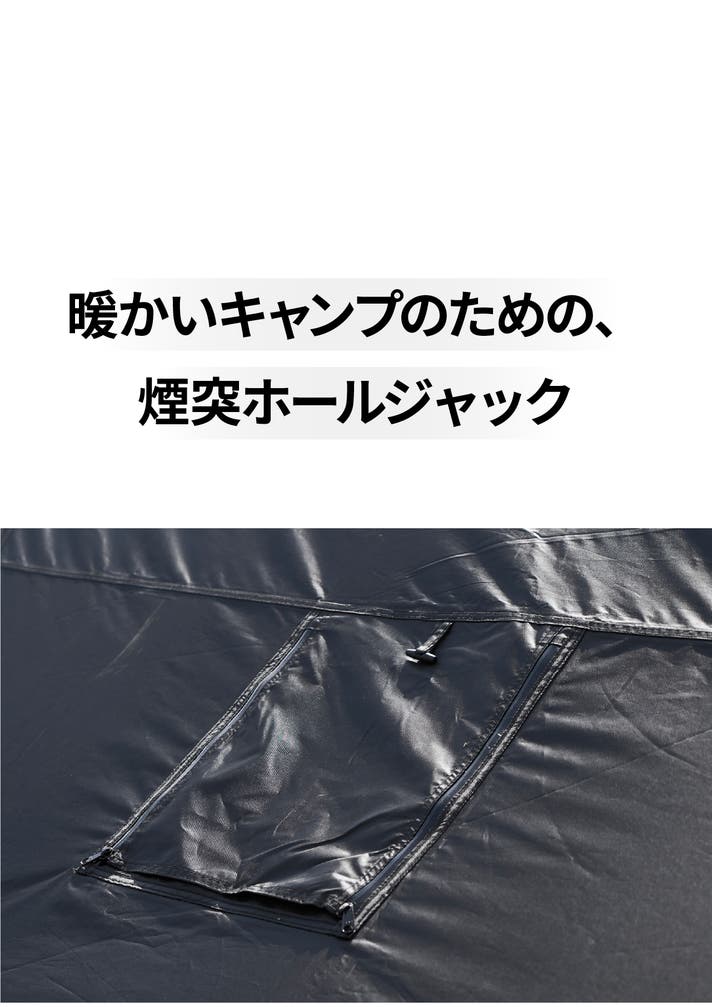 肌寒い秋の夜や冬シーズン、タープシェル下でストーブを使用できるよう、天井には煙突ホールジャックが設けられています。ホールジャックのカバー下には耐炎生地があり、使用者の煙突サイズに合わせて直接カッティングして使用可能です。