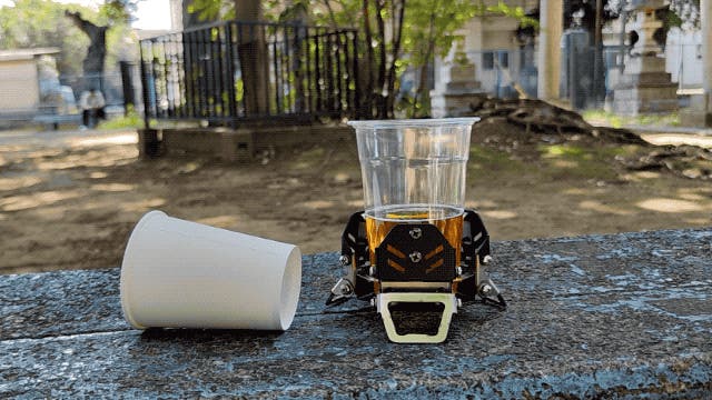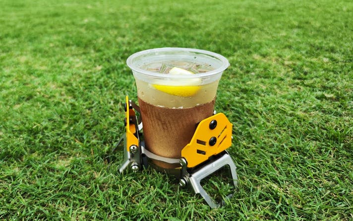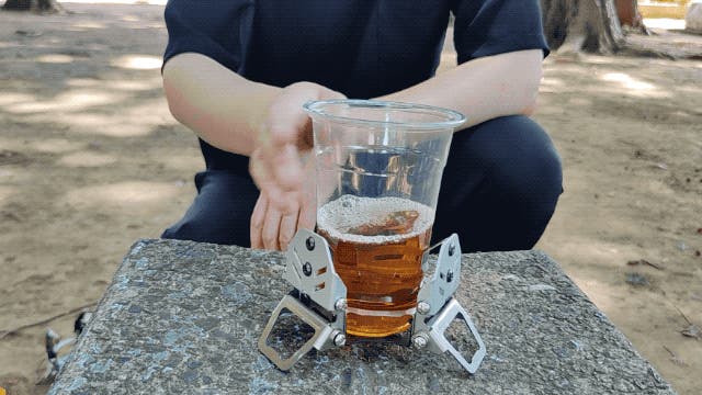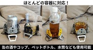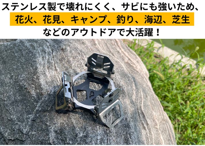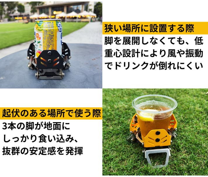 - 【どこでも安定】展開可能な三本脚。芝生・砂浜・斜面でも横揺れに強く、飲み物の転倒を防ぐ。