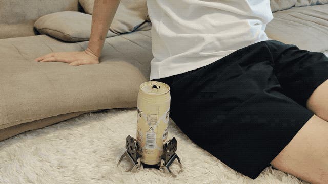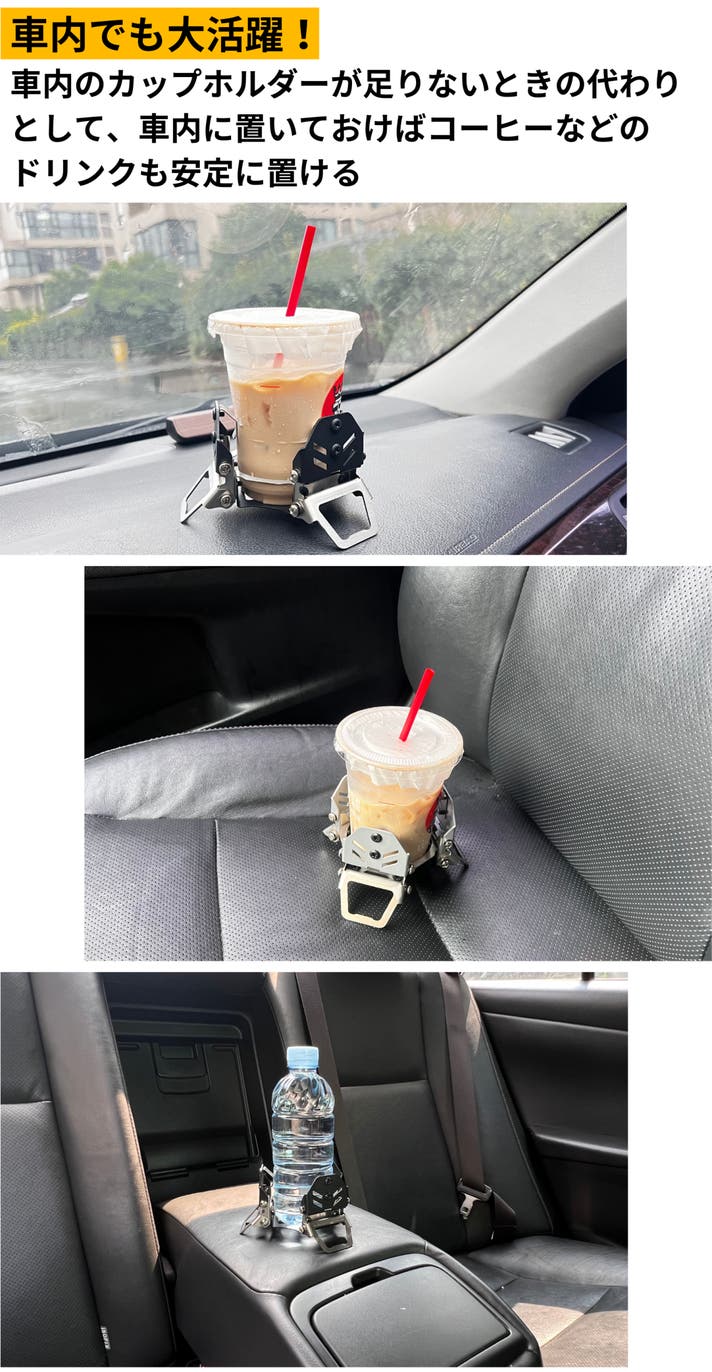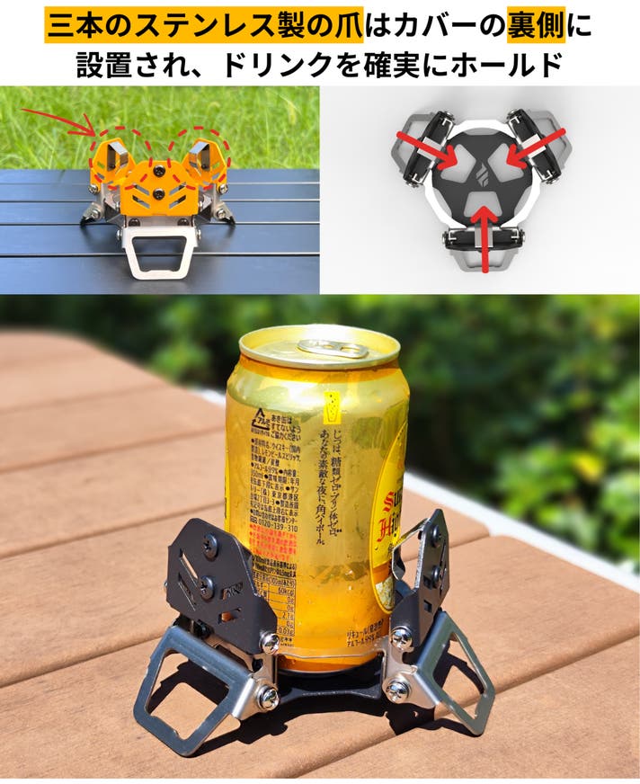 三本の爪がドリンクをしっかりと押さえ込み、缶やカップ、ボトルを確実にホールドします。