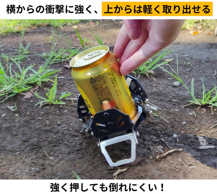 風の強い環境や不安定な地面でも倒れにくい設計で、アウトドアのドリンク置き場として頼れる存在です。