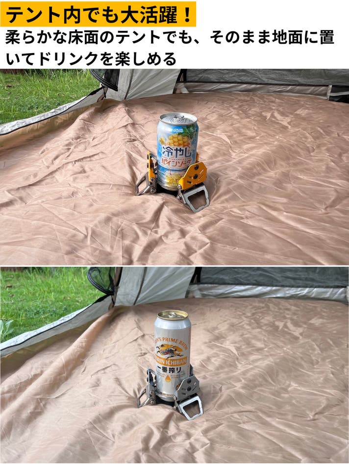 キャンプサイトでは、焚き火や調理スペースのそばに“個人用ドリンク置き”を増設でき、テント内や夜露、緩やかな傾斜でも低重心が安定感を保ちます。