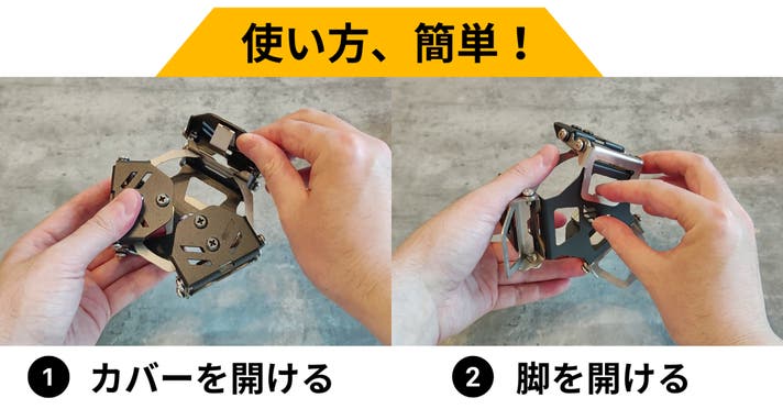 本体に備え付けられた3本の脚は展開式構造で、広げるだけでしっかりと地面に設置でき、安定性が格段に向上します。