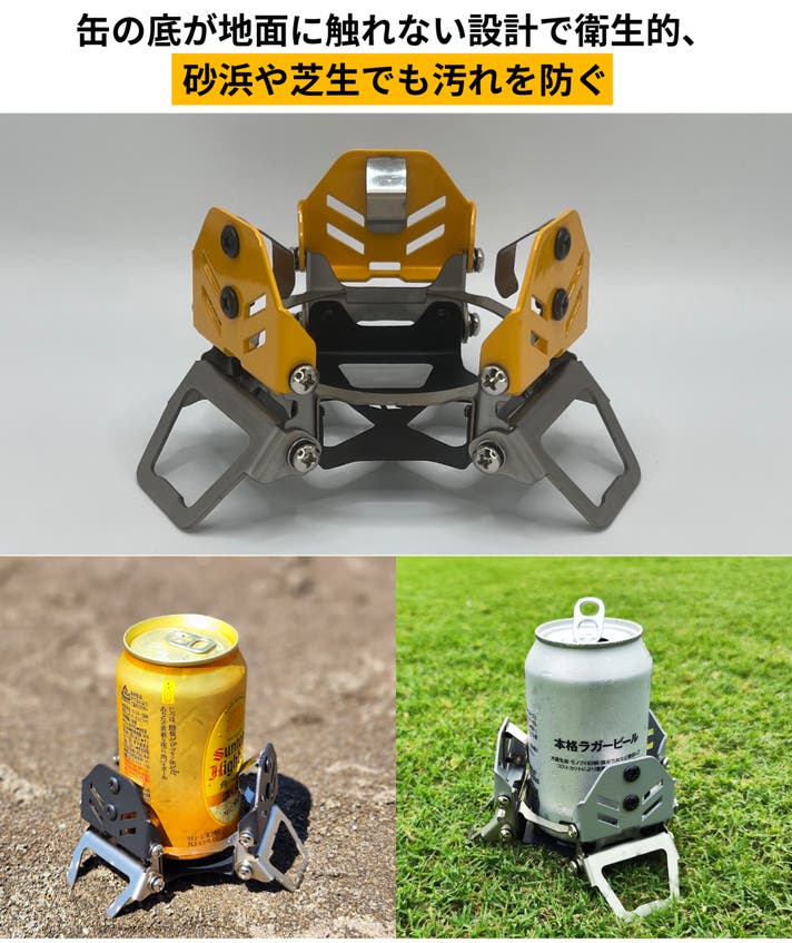 芝生や砂浜で使用する際も、缶の底面が地面に直接触れない構造のため、砂や土が付きにくく、後片付けも簡単です。