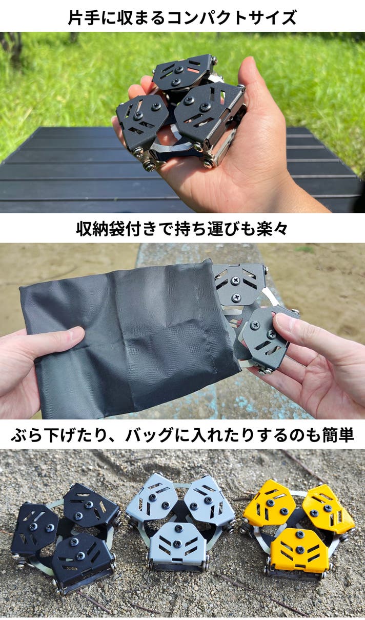 A:芝生・砂浜・土・斜面などの不整地でも安定する設計です。屋外イベントや花見、BBQ、海辺、デスク周りでも活用できます。