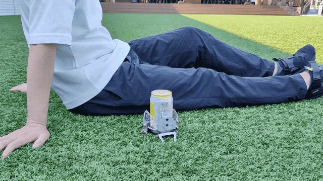 斜めの地面に座り、テーブルもなく、缶やコップを地面に置いたところ何度も倒してしまったのです。