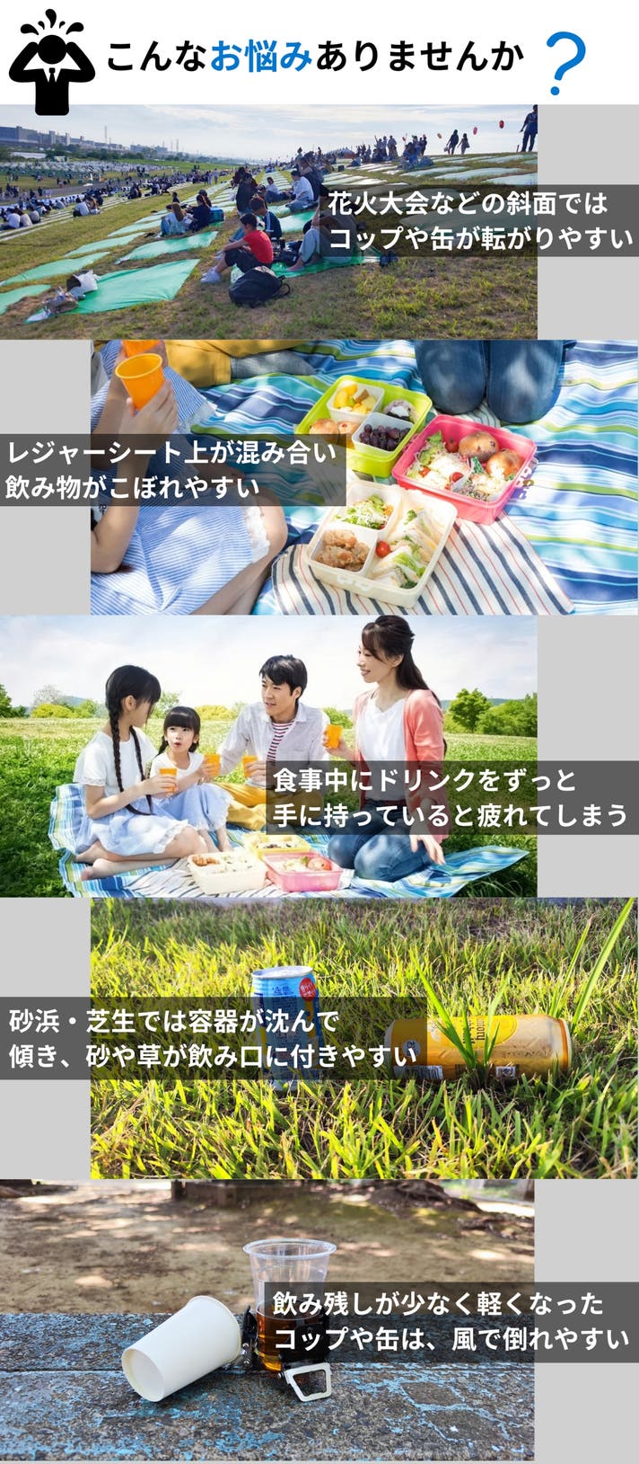 フェスやピクニックでは、レジャーシート脇にそっと置くだけで、座ったまま片手でサッと取ることができ、人混みや風でも横揺れに強く、こぼし事故を防ぎます。