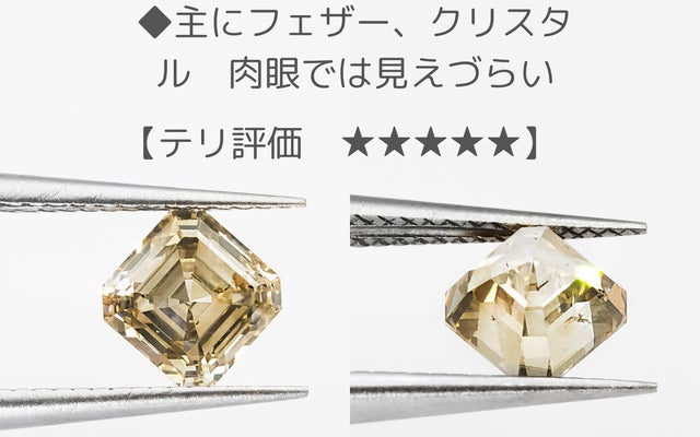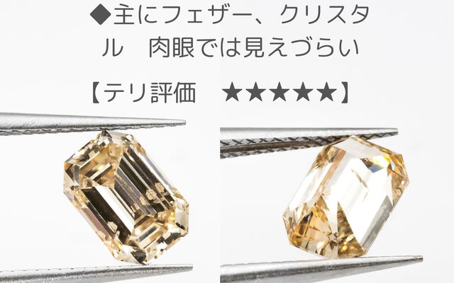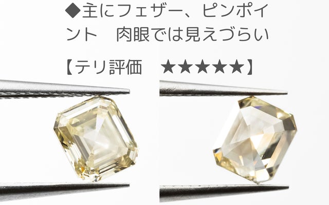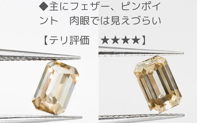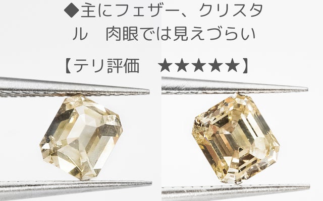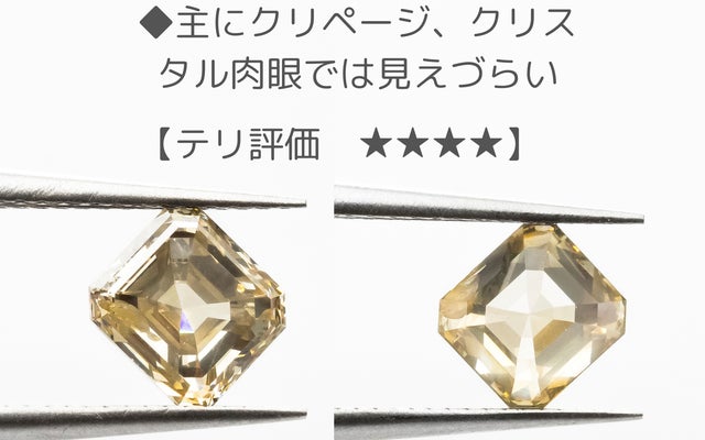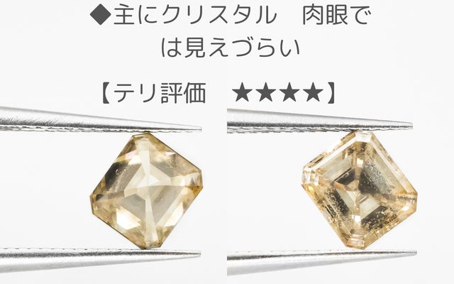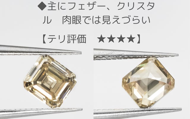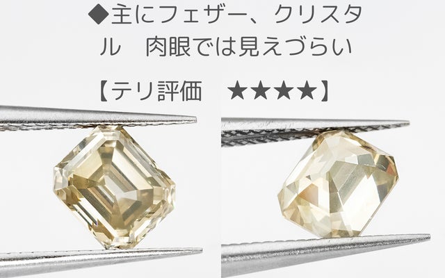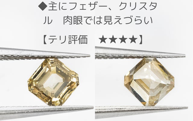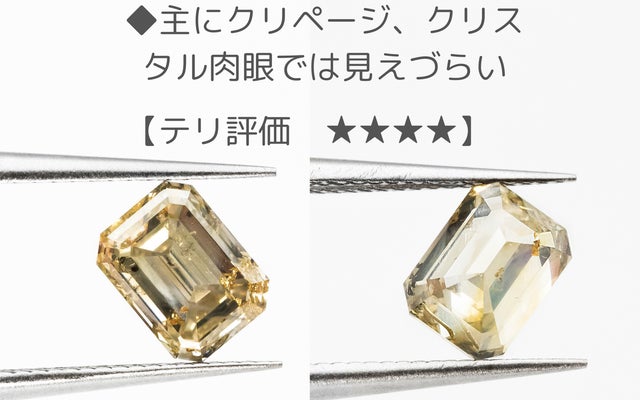 今回のエメラルドカットはその特徴を、テリ=透明度とミルキー度で評価しました