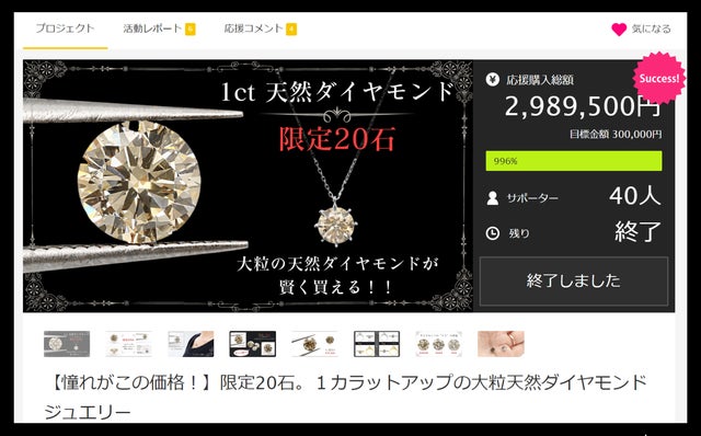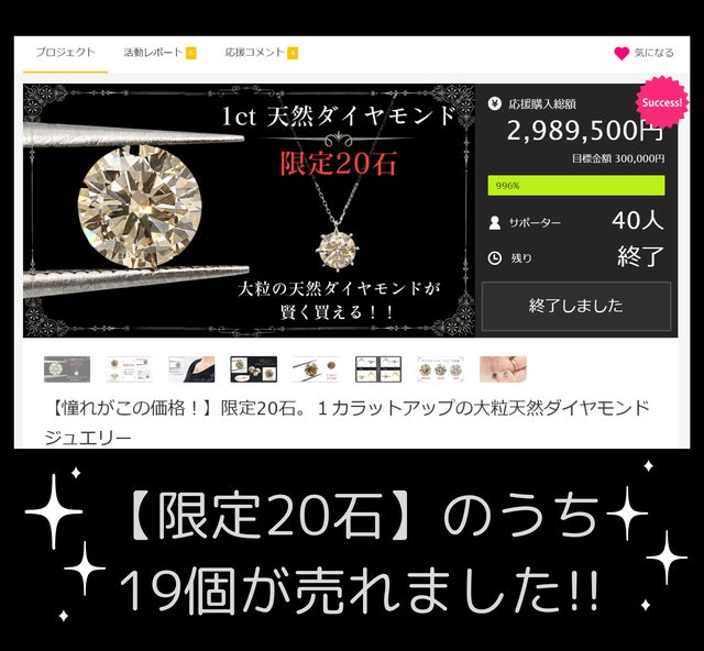 前回の第一弾【ラウンドブリリアントカット】では、限定20石のうち19個が応援購入されました!