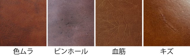 生きて活動をしていた動物の表皮から作られる皮革は、 生き物特有の個体差があります。ケガの跡や血管の跡、色ムラ、ピンホール、シワなどは合成皮革では見ることができない自然な風合いです。それぞれ異なる革の表情を、「個性」としてお楽しみ下さい。※革の裏面にも同様の特性が見られます。