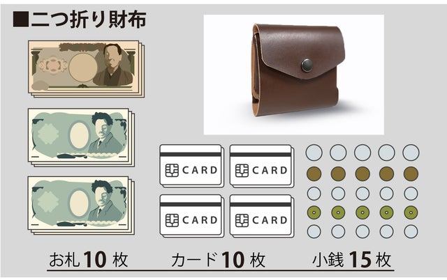二つ折り財布はカードを10枚まで収納できる設計となっており、さらに小銭15枚、お札も10枚収納できます。