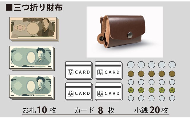 三つ折り財布はカードを8枚まで収納できる設計となっており、さらに小銭20枚、お札も10枚収納できます。