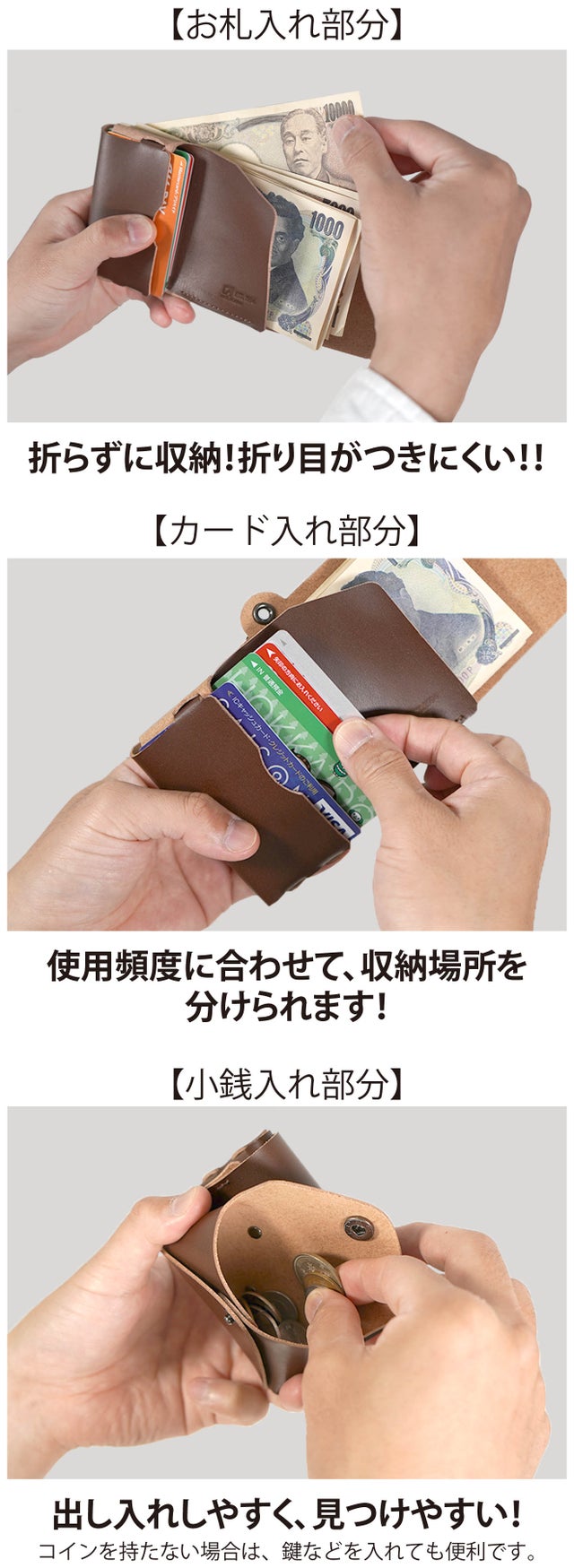 お札、小銭、カード類をスッキリ仕分けできる収納力とスリムな形状を両立させた構造です。