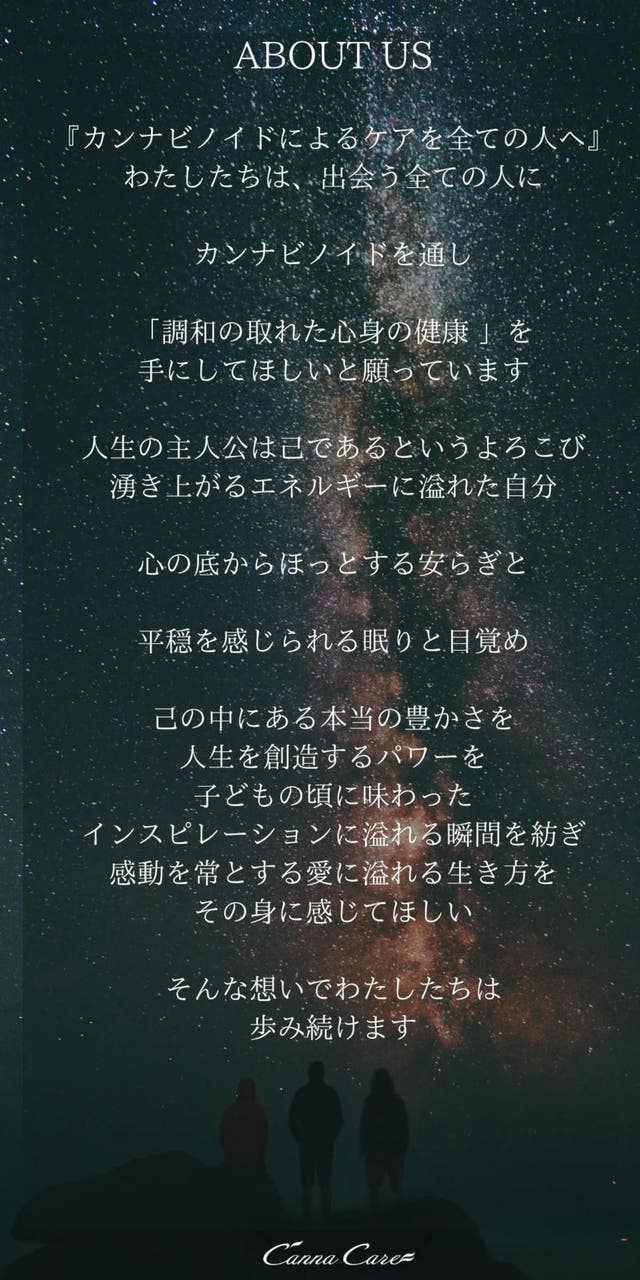 多忙で膨大なストレスを抱えるみなさまが、Canna Care製品を通してストレスを忘れ、リラックスタイムを過ごし明日から全力を出せるように、その一助となれば幸いです。