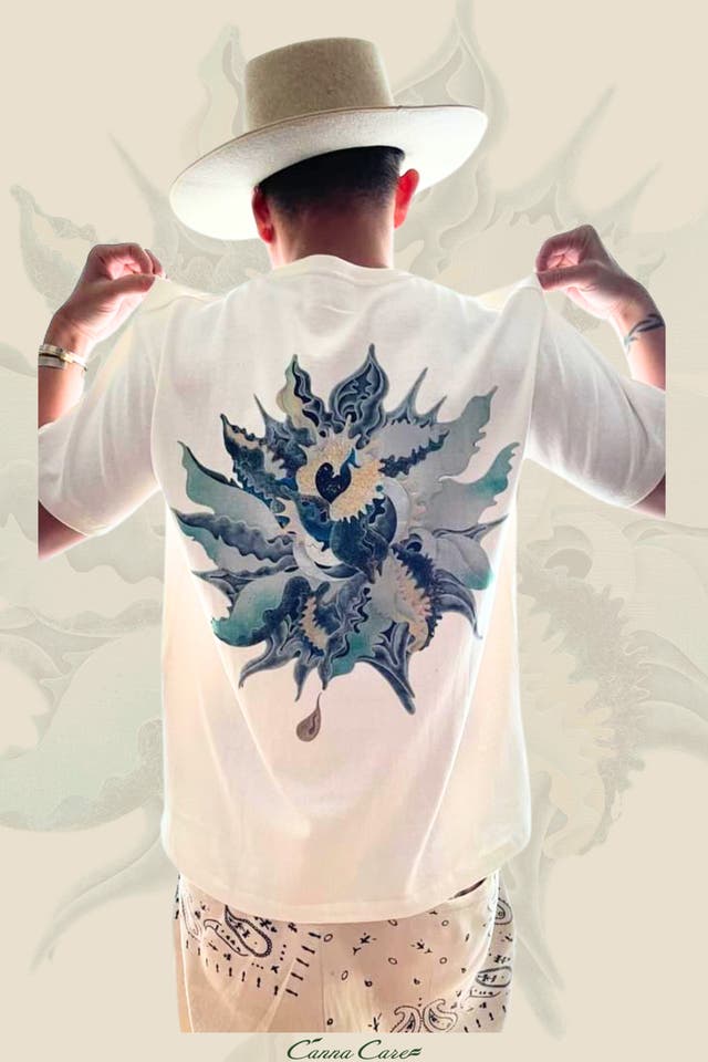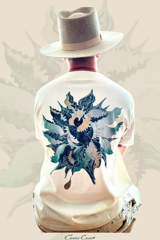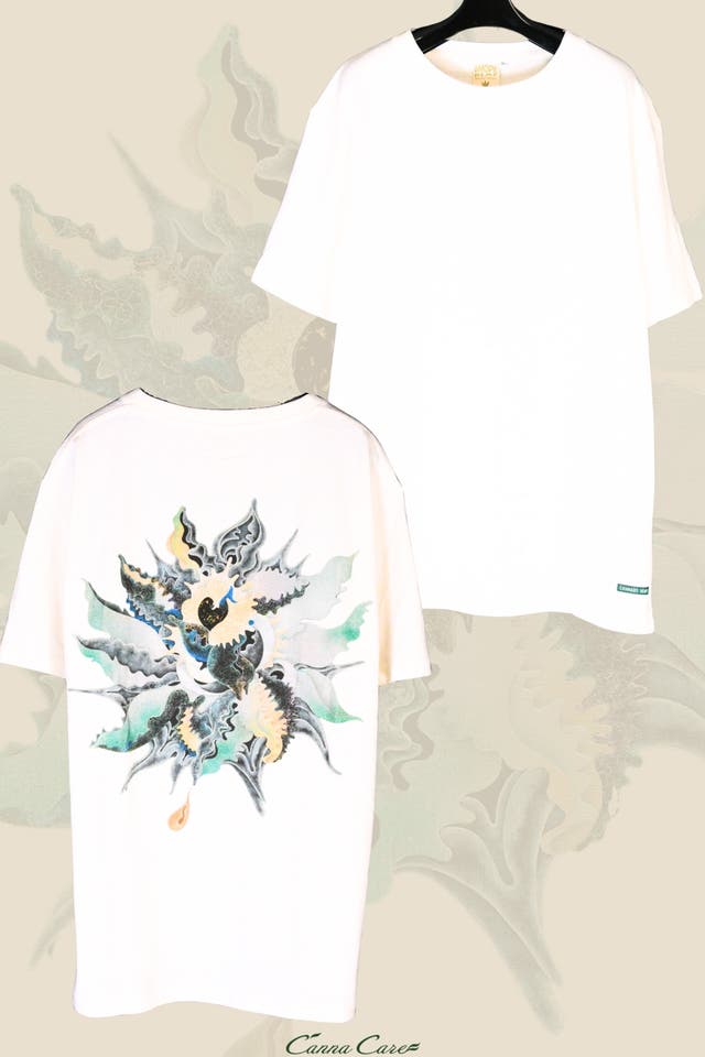 リターン品として特別にヘンプ生地、オーガニックコットンとの混合素材の 「A HOPE HEMP」のTシャツにプリントを行い、その世界観を投影した特別なアイテムとなっております。
