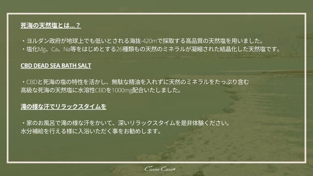 CBDと結晶化したヨルダンの死海の塩を活かし、無駄な精油を入れずに天然のミネラルをたっぷり含む高級な死海の天然塩に水溶性CBDを1000mg配合いたしました。