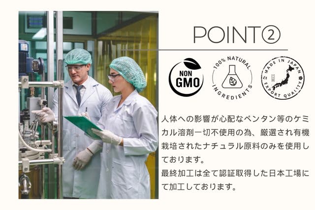 ・NON GMOはもちろんの事、MCT(中鎖脂肪酸)、VG(植物性グリセリン)、PG(プロピレングリコール)、などのケミカルな添加物は一切不使用のプロダクト。