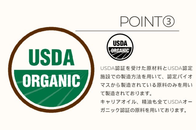 製品に「USDA Organic」マークを貼付できるのは、全成分の95%~100%が有機栽培からなる原材料で作られた製品のみです。
