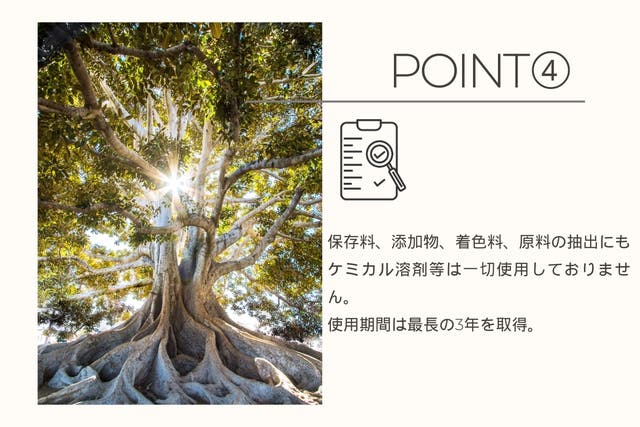 本来、人に存在する成分だからこそ、防腐剤、保存料、添加物、ケミカル溶剤を用いて抽出された原料も使用せず、すべて有機栽培されたオーガニックな原料のみで作りました。