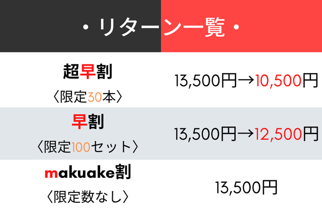 ※リピーター割はMakuake価格からの割引です。実際の市販価格は上昇する可能性が高いですが、未定です。