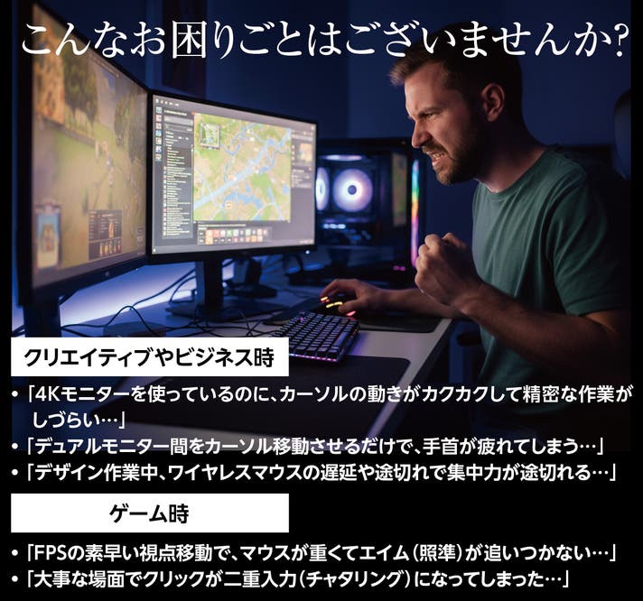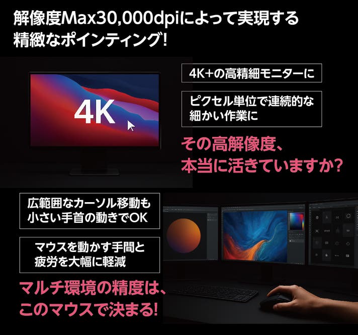 - 4K/8K高精細大画面や、マルチモニターで真価を発揮。ブレない、飛ばない、集中力が切れない!