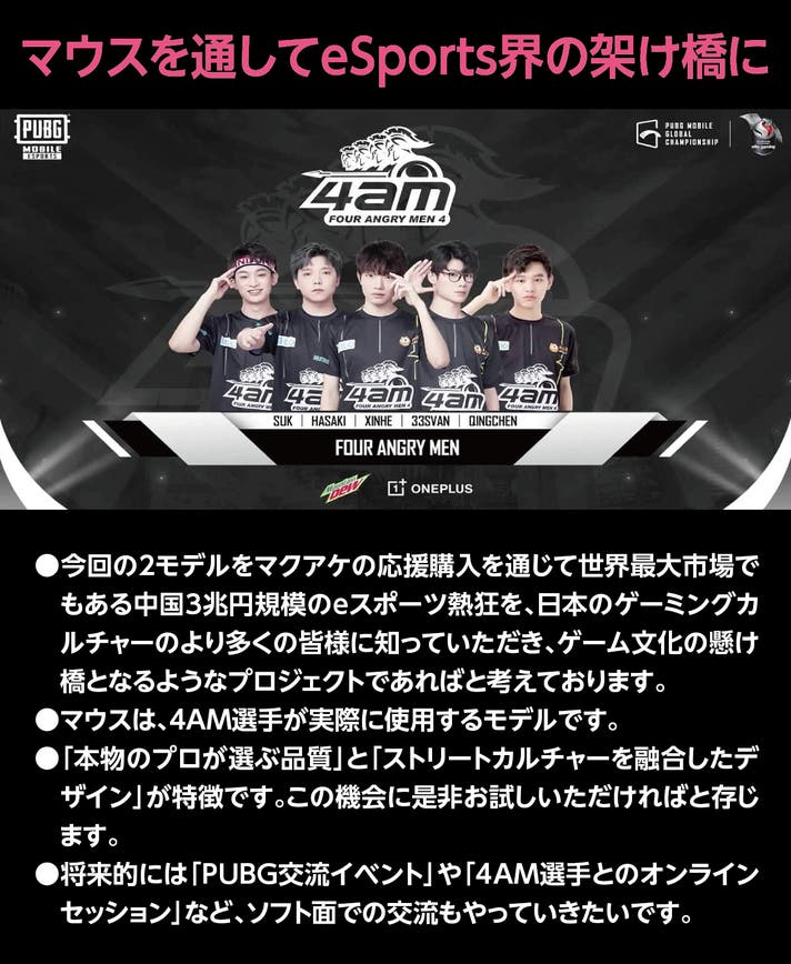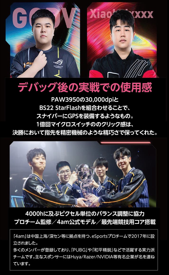 Shenzhen RuiDeHong Electronic Technolory., Ltd.は、中国深センに工場を持つマウスメーカーでありゲーミングマウスの生産に長年携わってきました。今回の2モデルはeSportsのプロチームである「4am」と長期間に渡る共同開発を経て完成させました。