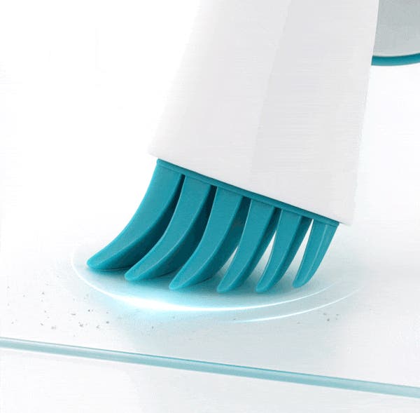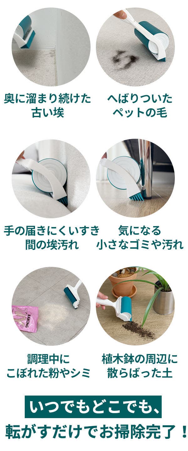 ゴムのしなやかさとプラスチックの丈夫さを兼ね備えたスクレーパーが、ゴミや汚れをしっかりキャッチして集めます。埃を集めて、転がしてキャッチ!効率よくお掃除ができます。