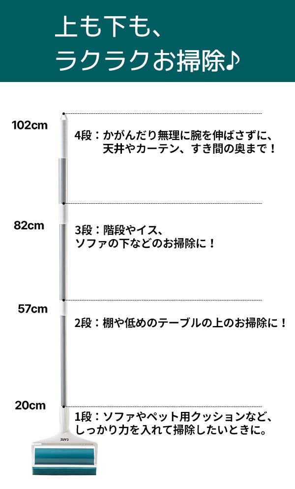- スクレーパー付きクリーナーで見えない埃・汚れ・髪の毛までしっかりかき集めて密着&徹底キャッチ!