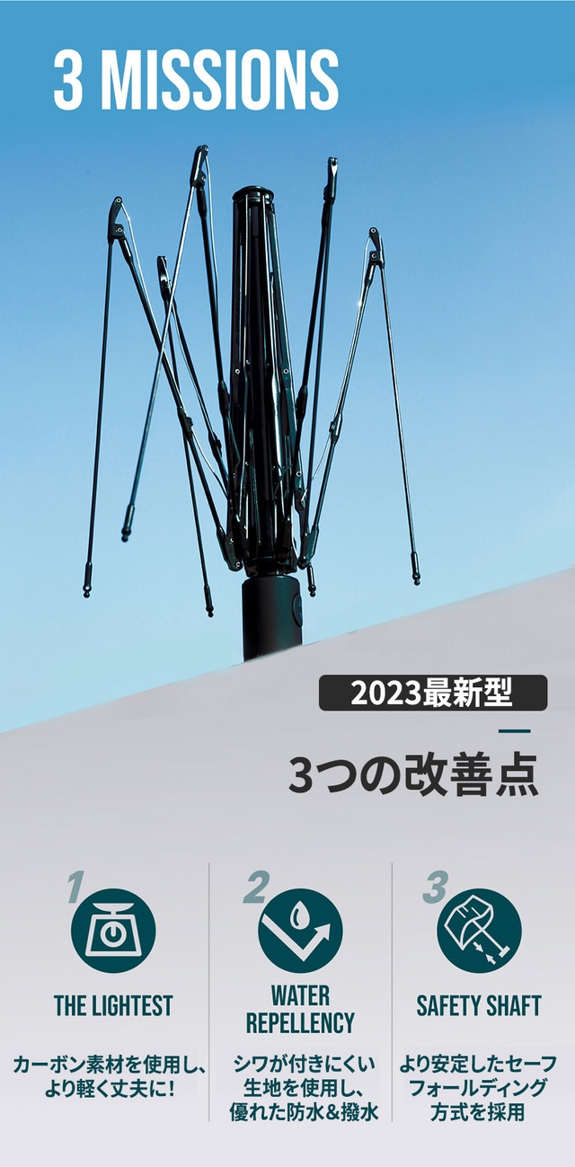 傘を差しながら感じる不便さや重さ、破損リスクなどを少しでも減らしてくれる”一生ものの傘”になることを切に願いながら、カーボン自動開閉傘をみなさまにご紹介いたします。本商品は従来の傘を改良した末に誕生しました。いつも応援してくださる皆様に心より感謝申し上げます。2023年も何卒よろしくお願いいたします。