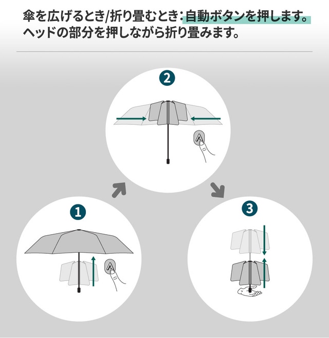 ● 傘を広げるとき & 折り畳むとき:自動ボタンを押します。開閉時ボタンを一度押すだけでOK!