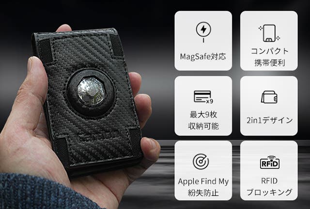- Appleの「探す」機能連携で位置追跡可能。RFIDブロッキング技術でスキミング防止も万全。